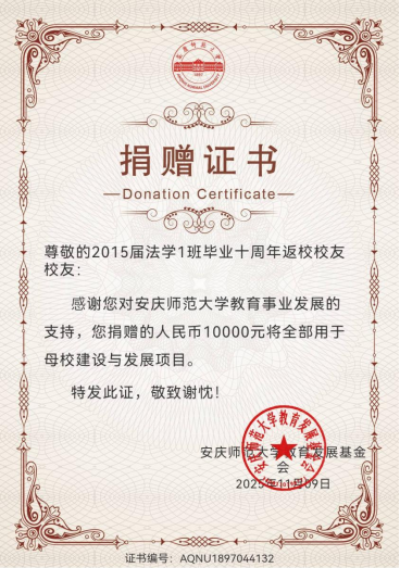 11月8-9日,明升官网 2015届法学1班组织校友毕业十周年返校活动,向安庆师范大学教育发展基金会捐赠人民币1万元,并深情寄语:毕业十年,心怀母校。下一个十年,祝母校再创更多辉煌!(此捐赠款项用于支持明升官网 人才培养及各校友交流工作)(撰稿:李丹 审核:钱敏)