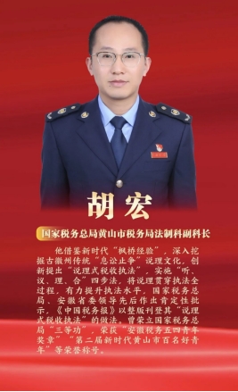 胡宏,安庆师范大学法学专业2009届毕业生,在校期间曾获国家奖学金。2009年通过国家公务员考试入职黄山市税务局,曾挂职安徽省税务局、国家税务总局。目前任黄山市税务局法制科副科长、三级主办。公职律师、税务师,省税务局兼职教师、青年才俊。