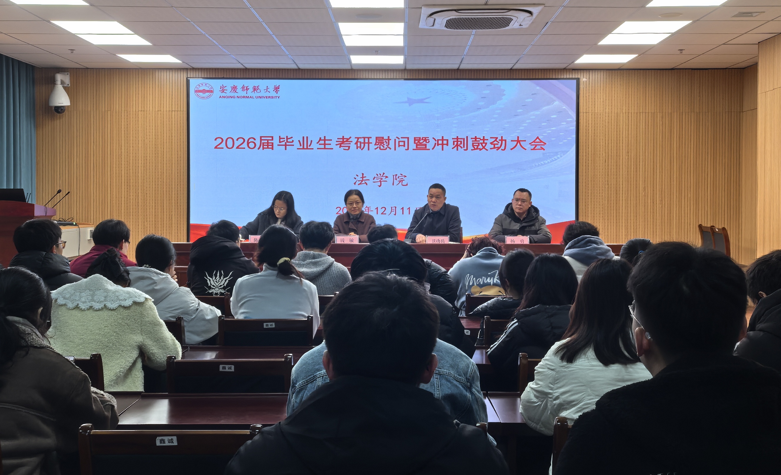 12月11日,明升官网 在102法治大讲堂举办2026届毕业生考研慰问暨冲刺鼓劲大会。明升官网 党委书记钱敏出席会议并讲话,2026届毕业班辅导员、考研学生参加会议,党委副书记卫功兵主持。