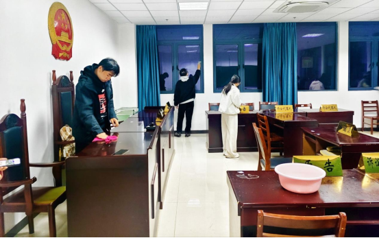为营造整洁、有序的模拟法庭实训氛围,大学生青年法学会联合明升官网 六尺巷学生事务服务中心成员开展劳动实践教育活动。同学们分组对模拟法庭的审判台、旁听席、文书资料室进行全面清扫,整理法律书籍、规整庭审道具、擦拭设备仪器,将劳动教育与专业场景深度融合,在动手实践中体会劳动价值,为后续模拟庭审、教学实践的开展提供良好环境保障。