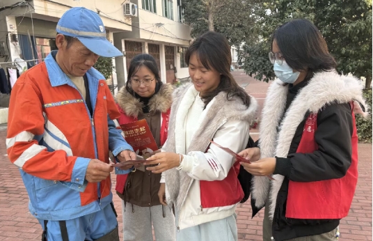 学生志愿者走进燎原社区,通过发放宣传资料、现场互动讲解等形式,将“高大上”的宪法条文转化为群众听得懂、用得上的“家常话”。同学们结合日常生活中的常见典型案例,重点围绕公民的基本权利与义务、未成年人保护、防范电信诈骗等内容进行普法宣传,吸引了众多社区居民的聆听和咨询。在永林小学,志愿者们把“公民基本权利”改编成维权竞答题,现场气氛热烈融洽,孩子们边笑边抢答:“原来宪法离我们这么近!”“原来宪法也是我们的‘护身法宝’!”