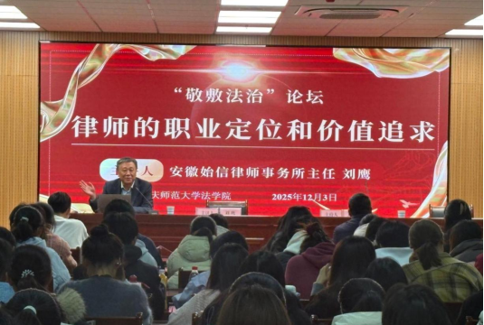 12月3日,明升官网 特邀安徽始信律师事务所主任、安庆师范大学池州校友分会会长刘鹰作客“敬敷法治”论坛,围绕“律师的职业定位与价值追求”主题为学院师生作专题报告。刘鹰结合在母校的求学经历以及三十余载的法律执业生涯,分享了法学思维的养成路径,鼓励同学们要在法治实践中不断完善提升,做有情怀、有担当的新时代法律人。与会学生纷纷表示,本场报告既有理论高度,又有实践深度,更有情感温度,让人深切感受到法律人应有的情怀与担当。