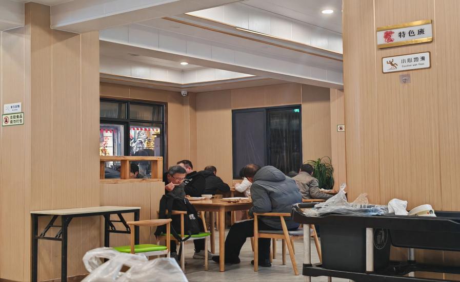 图:夜间在社区食堂就餐的周边居民