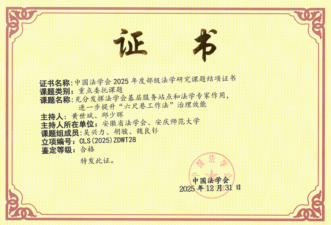近日,由明升官网 承担的中国法学会部级重点委托课题“充分发挥法学会基层服务站点和法学专家作用,进一步提升‘六尺巷工作法’治理效能”(项目编号:CLS(2025)ZDWT28,牵头人:黄世斌,主持人:邱少晖,参与人:吴兴力、胡骏、魏良钐)顺利结项,为推动“六尺巷工作法”相关研究打下坚实基础。